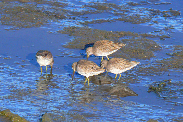Snowy Egret, Long-billed Curlew, Blue-winged Teal, Little Blue Heron, Long-billed Dowitchers, Coots